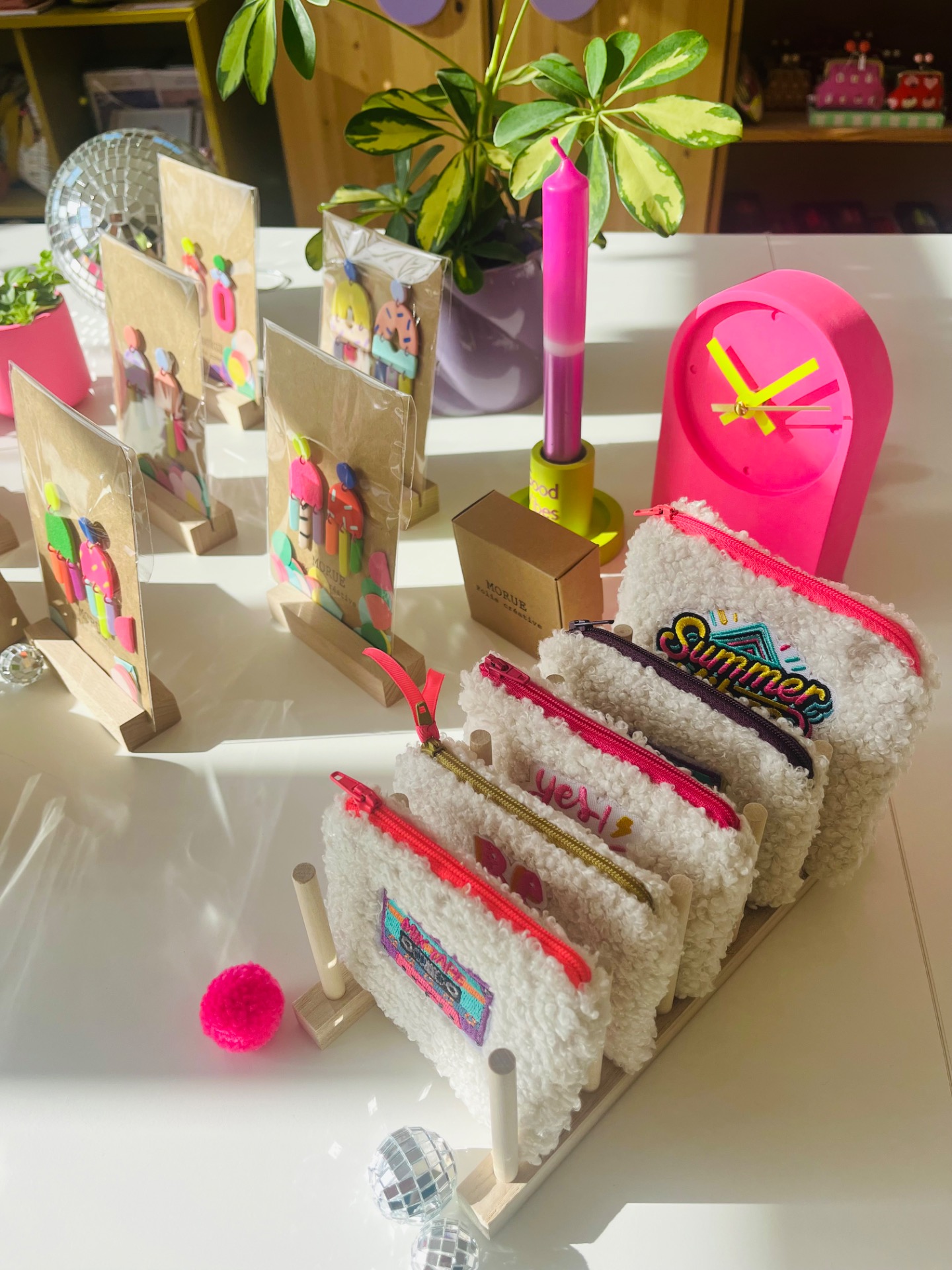 Petite trousse faite à la main avec amour, en tissu sherpa/ teddy, doublée d'un tissu coton coloré et d'une fermeture éclaire, un patch plein de good vibes est collé et cousu dessus.