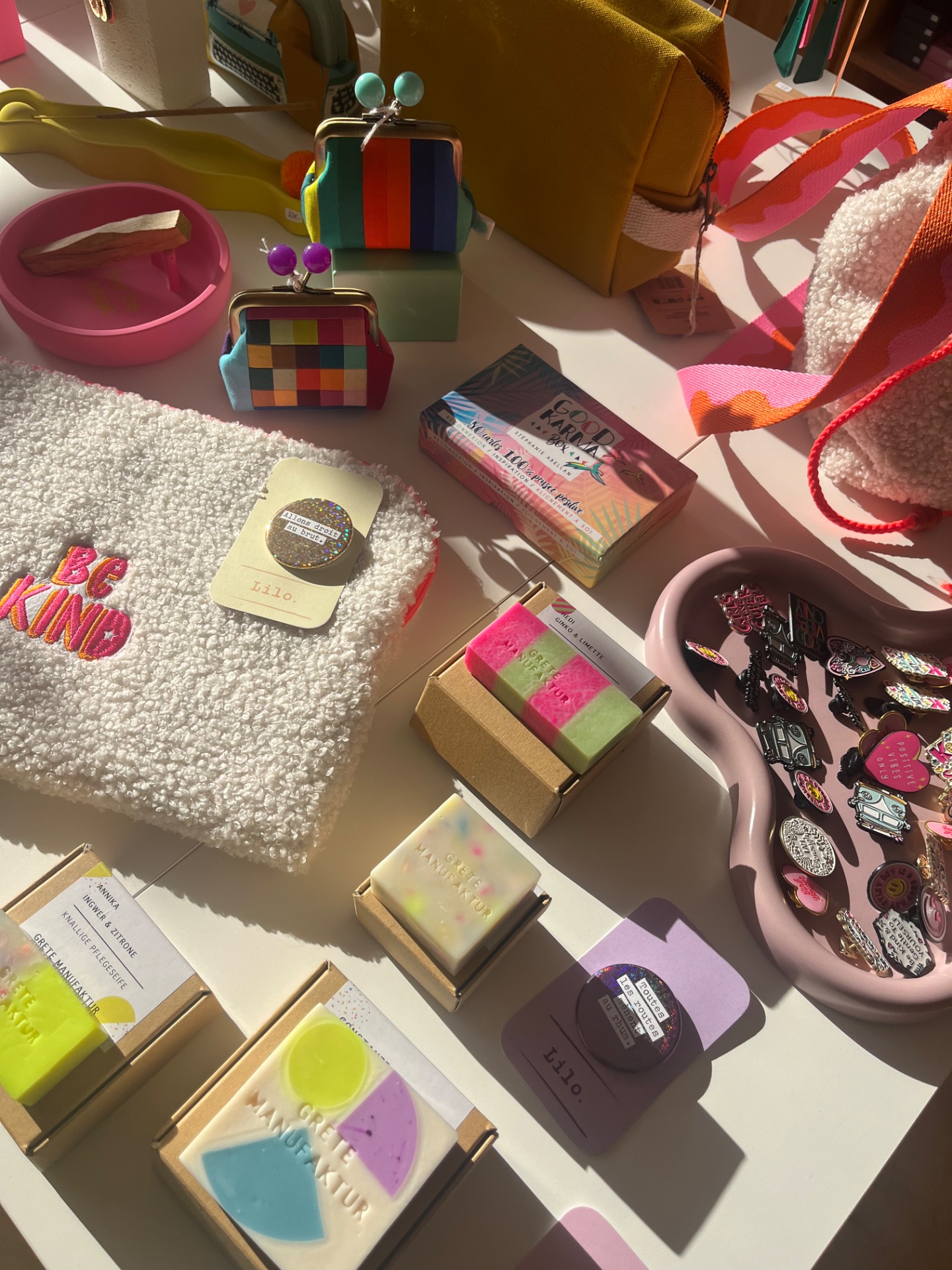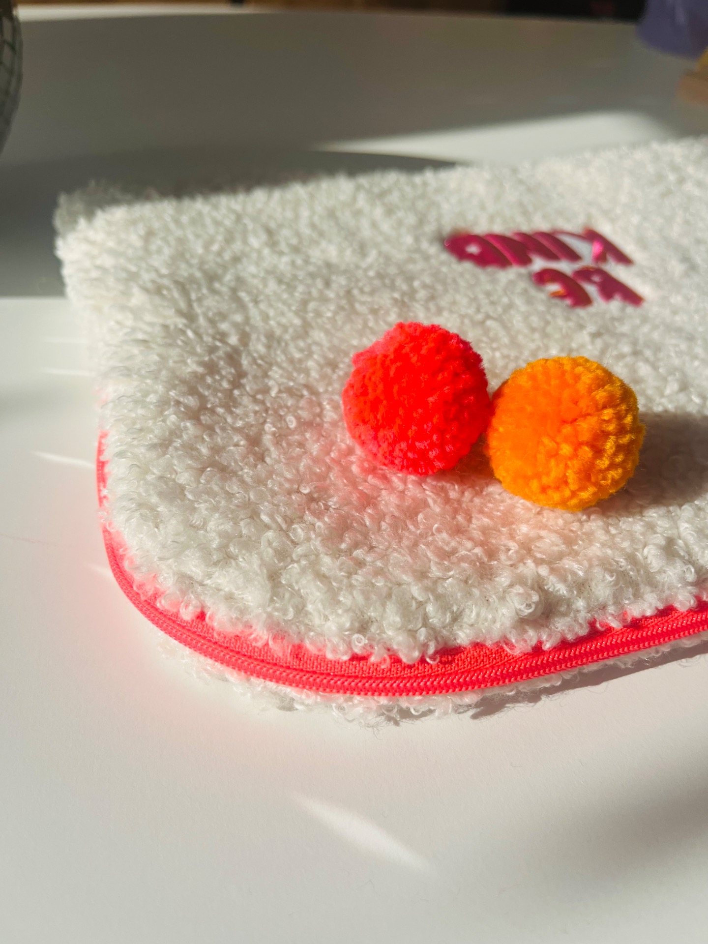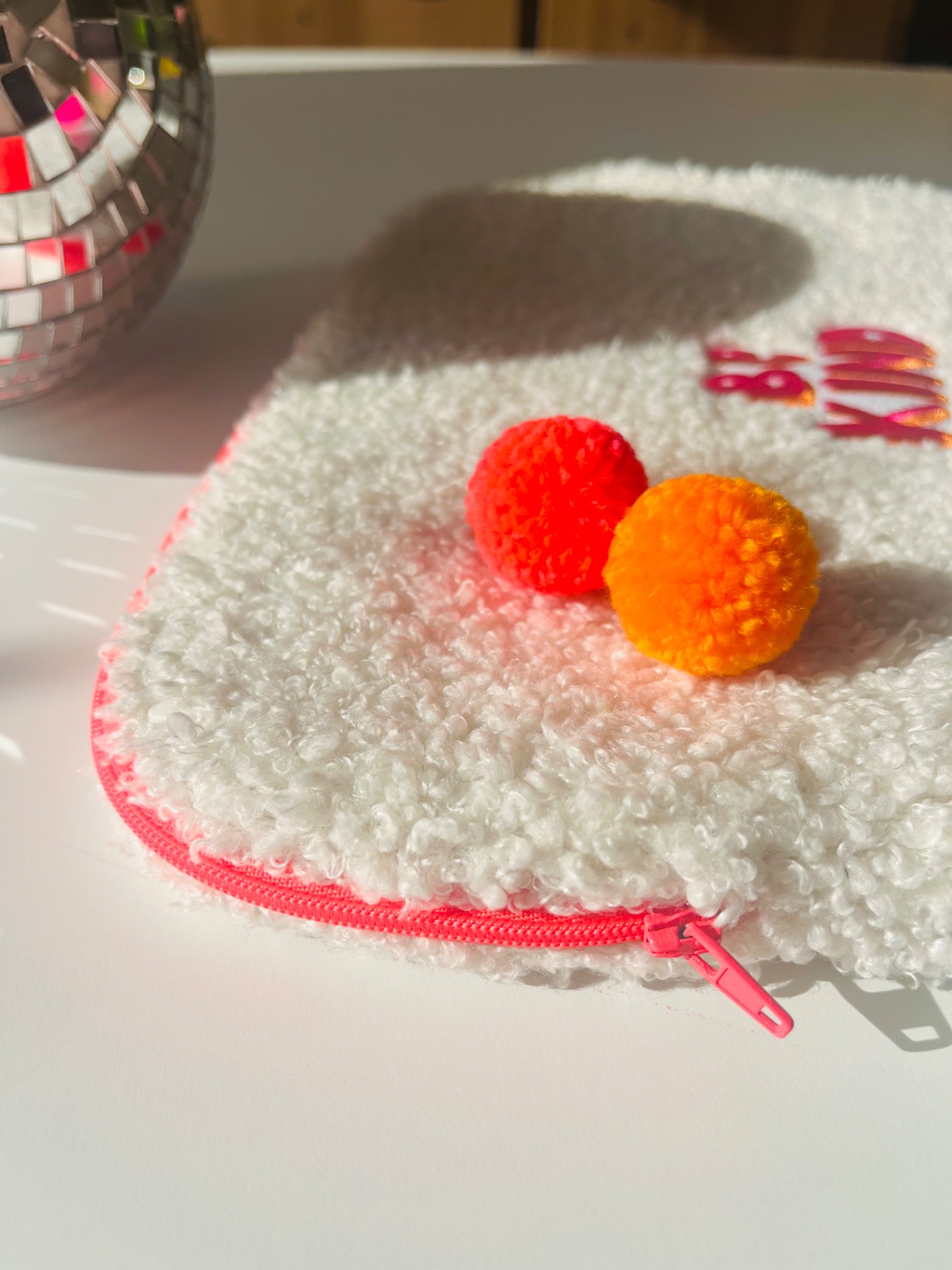 Pochette pour ipad, en tissu sherpa blanc cassé, doublé de tissu coton oekotex, tirette rose, patch « Be Kind »