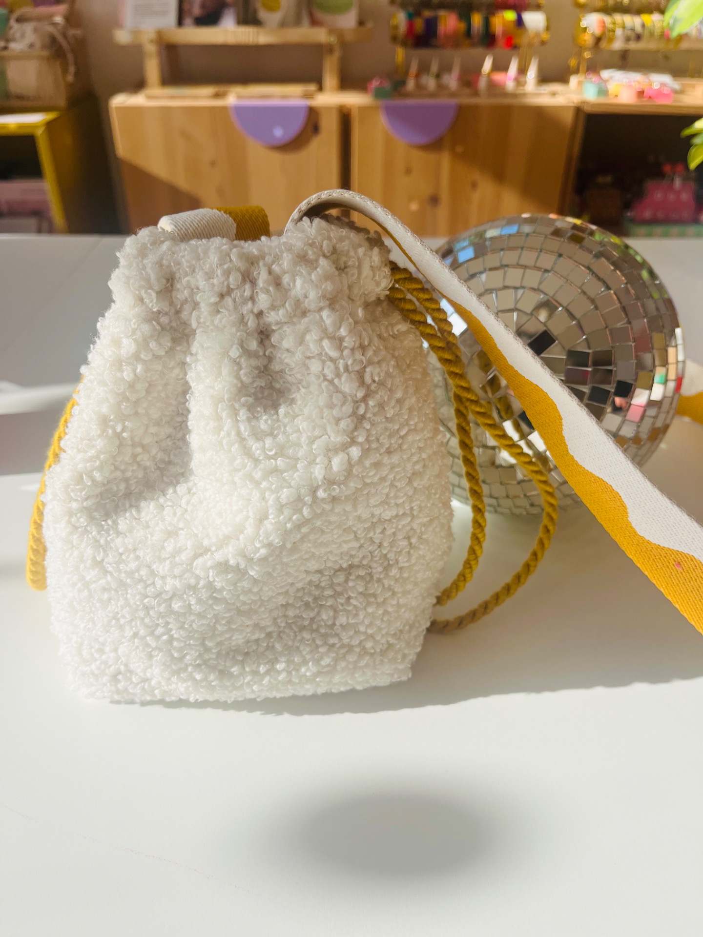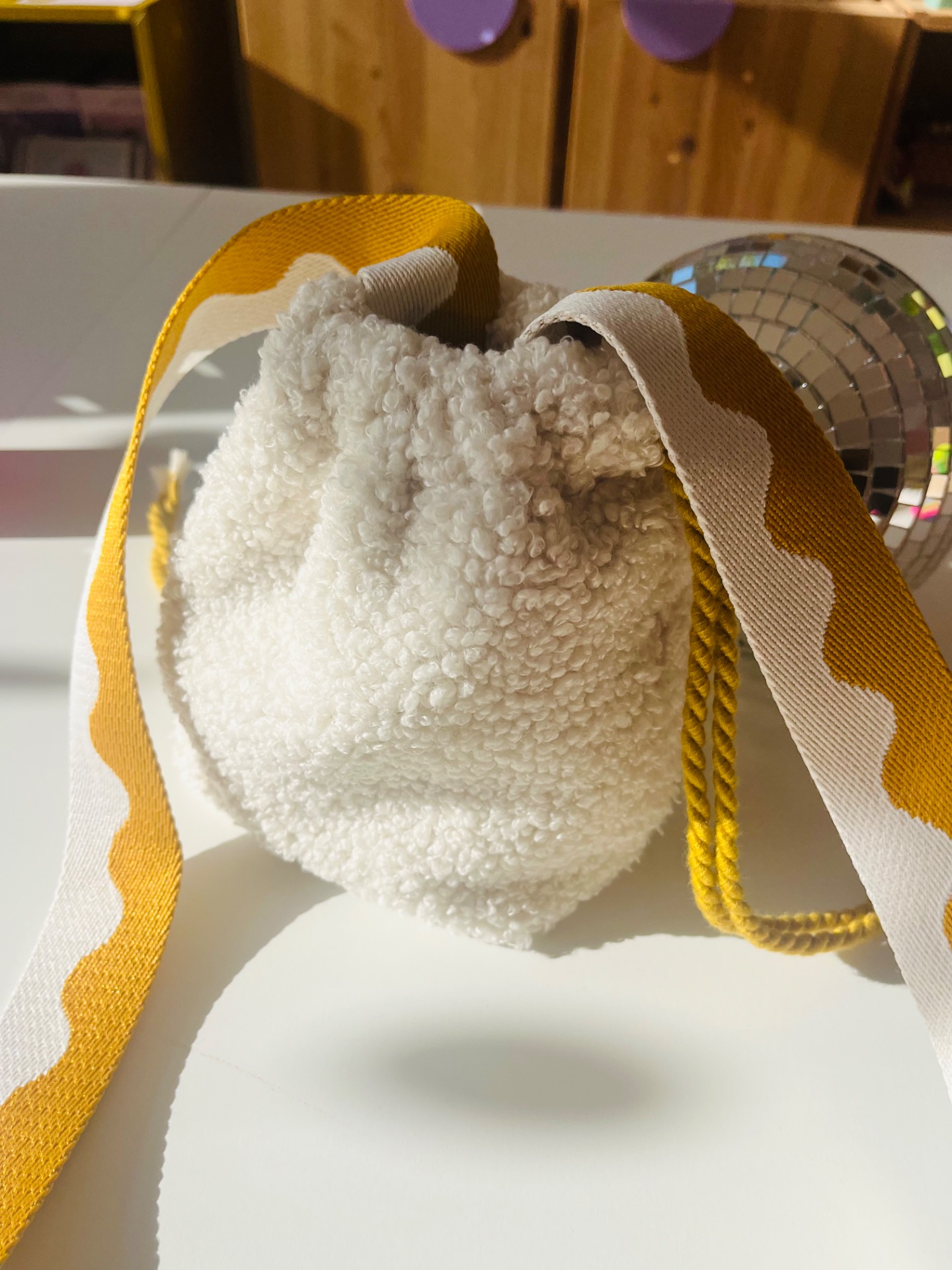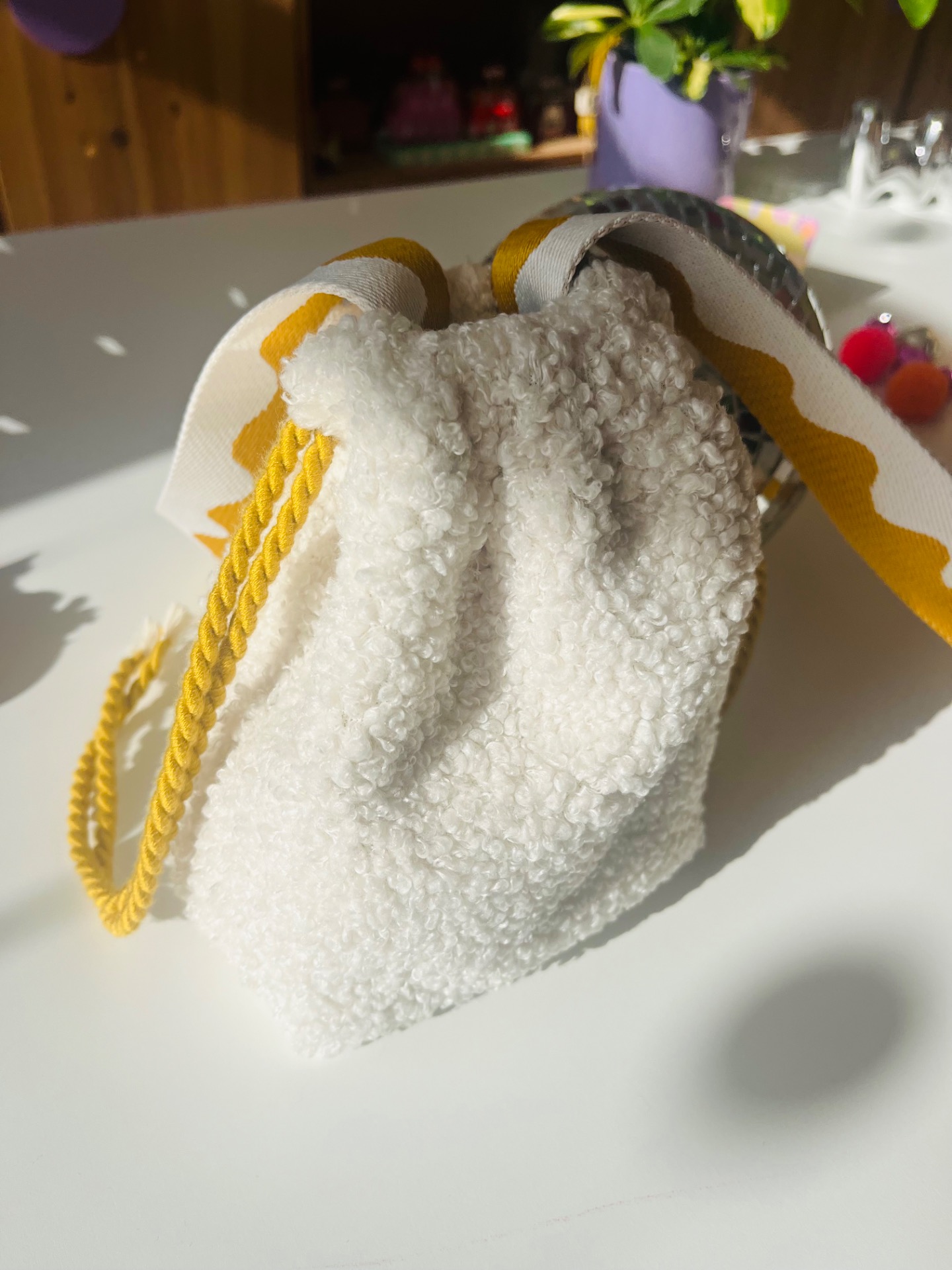 Sac pochon en tissu sherpa blanc cassé ultra tendancé avec une jolie sangle colorée, doublé d’un tissu coton, il se ferme avec des cordons sur le côté.